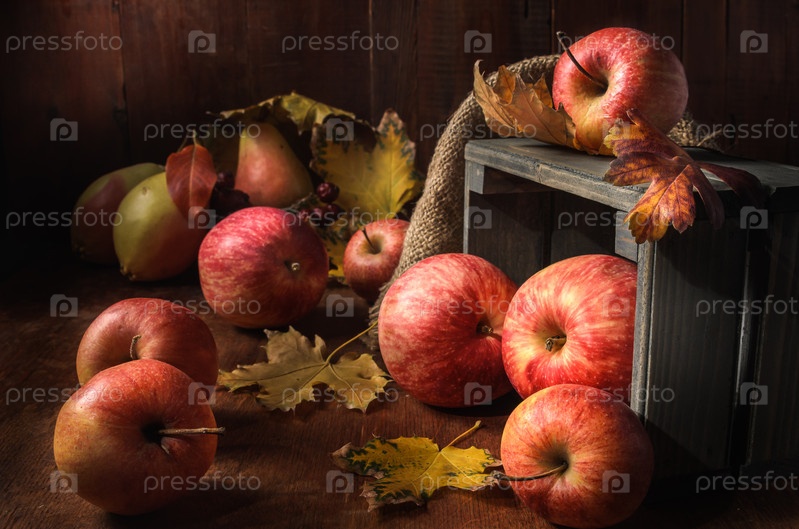 Яблоки навалом на темном деревянном фоне в деревенском стиле
