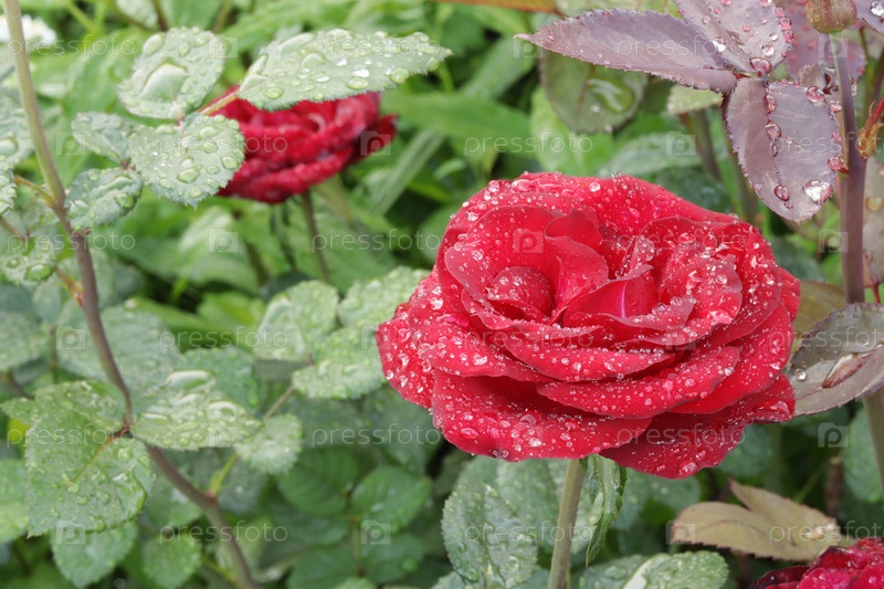 Капли дождя на розе в ясный солнечный день