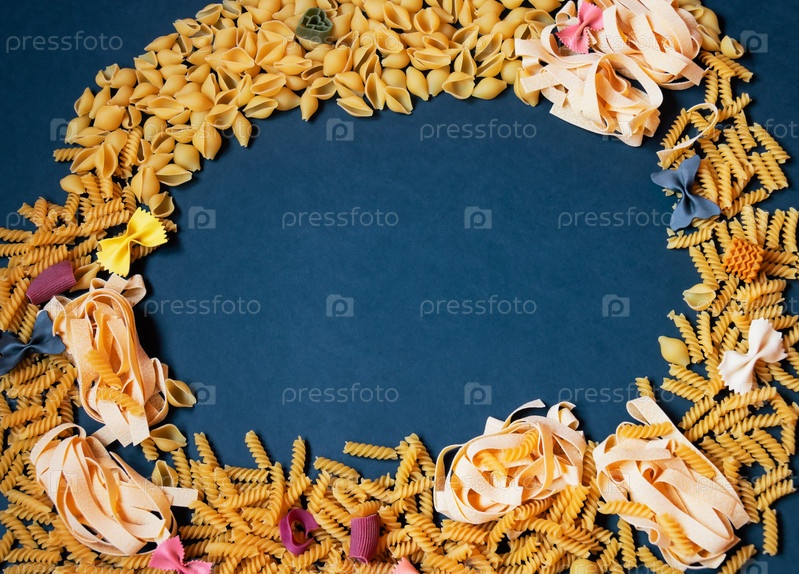 Рамка из различных видов сырой пасты на темном фоне
