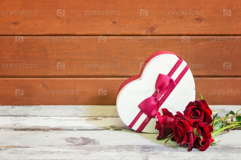 Подарочная коробка в форме сердца и красные розы на старом деревянном столе