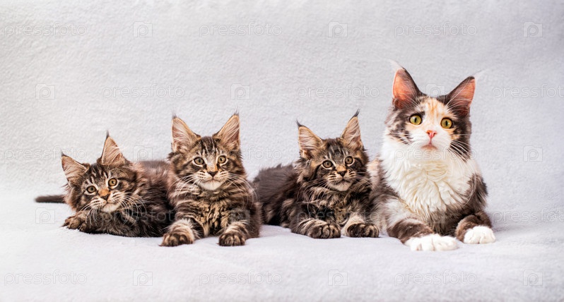 Мама-кошка семьи мейнкун и три котенка лежат на легком пушистом одеяле