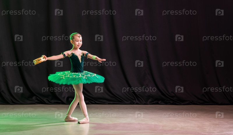 Маленькая балерина танцует на сцене в пачке на пуантах с бубном, классическая вариация Эсмеральды