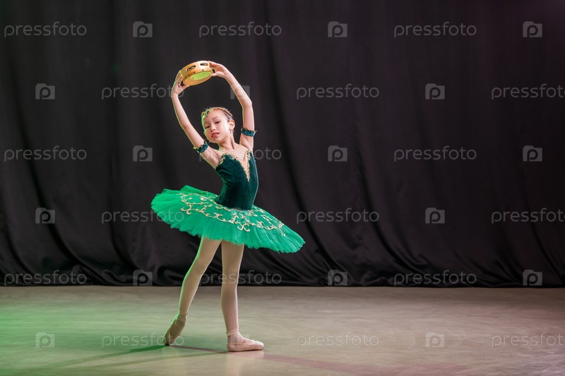 Маленькая балерина танцует на сцене в пачке на пуантах с бубном, классическая вариация Эсмеральды