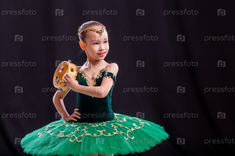 Маленькая девочка-балерина танцует на сцене в пачке на пуантах с бубном, классическая вариация Эсмеральды