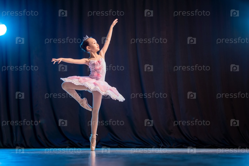 Маленькая балерина танцует на сцене в белой пачке на пуантах - классический вариант