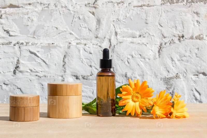 Натуральная косметика с растительными компонентами. Натуральное масло календулы. Пустая упаковка для этикеток