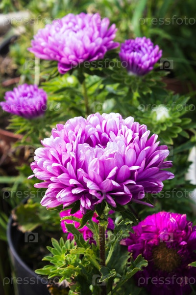 Цветы астры. Астры крупным планом на фоне зелени. Фиолетовые астры в начале сентября. Выборочный фокус