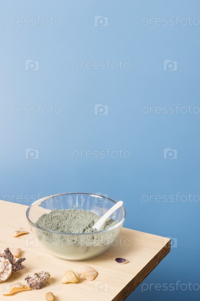 Косметическая голубая глина. Подготовка маски для лица. Современный уход за кожей. Натуральная косметика. Синий фон. Место под текстом