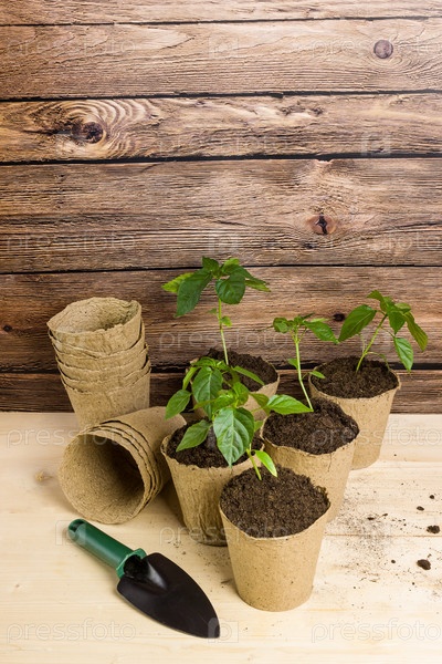 Рассада в торфяных горшочках. Рассада болгарского перца. Садоводство. Весенняя посадка. Ранняя рассада болгарского перца, выращенная в домашних условиях