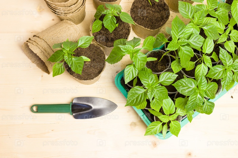 Рассада перца в горшках в торфяных горшочках и пластиковом контейнере. Садоводство весной. Молодые саженцы в горшках