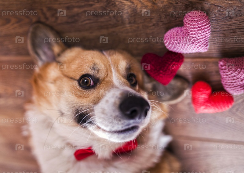 Портрет собаки корги, лежащей на полу среди символов любви на вязаных алых и розовых сердцах и довольно улыбающейся