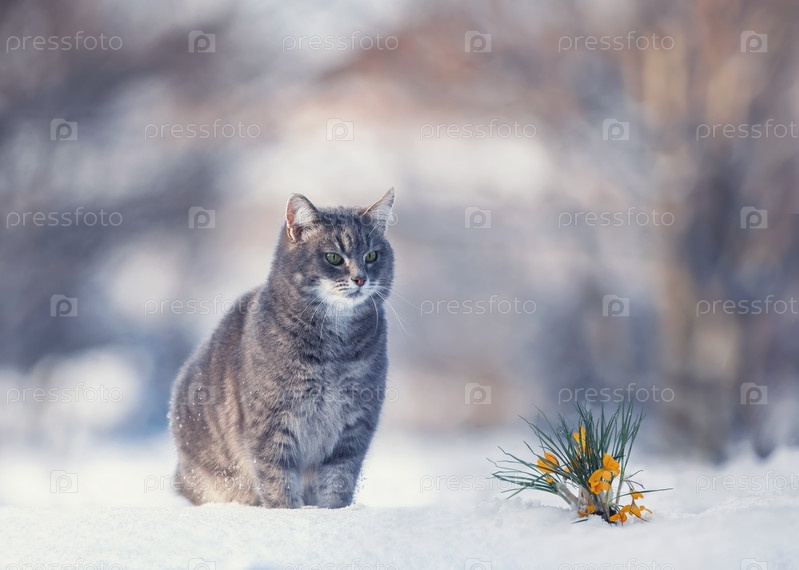 Красивая кошка гуляет в саду под снегом рядом с желтыми цветами крокуса ранней весной