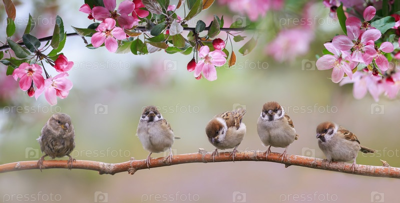 Маленькие птицы воробьи сидят на ветке с цветами в майском солнечном саду