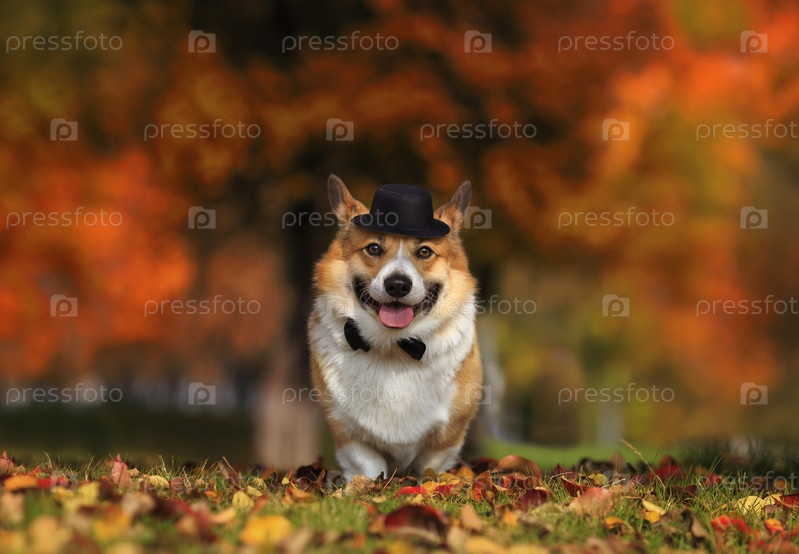 Портрет собаки корги в черной шляпе и галстуке-бабочке джентльмен стоит на траве в осеннем солнечном парке
