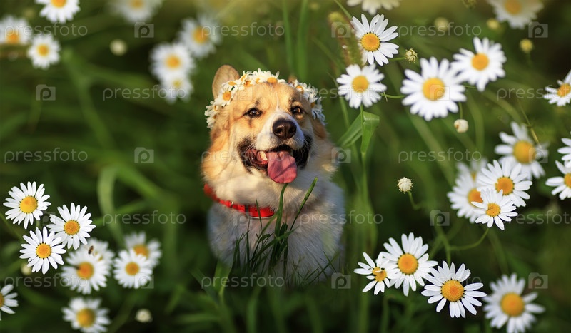 Милая собака корги сидит на летнем солнечном лугу в окружении цветов ромашек