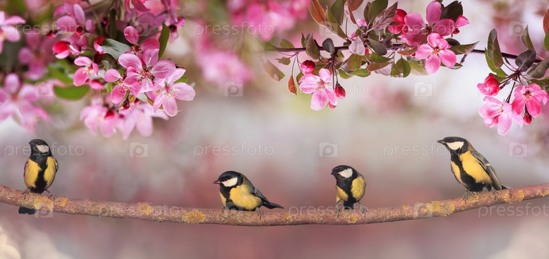 Птицы синица сидят в весеннем солнечном саду на ветвях яблони с розовыми цветами