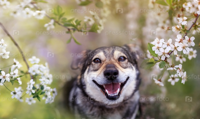 Портрет милой собаки среди вишневых цветов в солнечном саду мая
