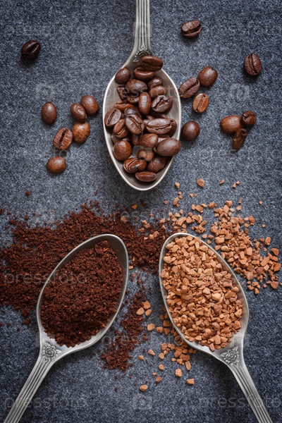 Три вида кофе в серебряных ложках