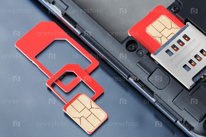 Сотовый телефон с встроенной SIM-картой и SIM-картой с рамами разных размеров