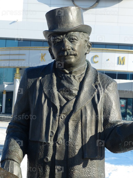 Фрагмент памятника братьям Люмьер - Огюст Люмьер. Рядом с фигурами братьев и их изобретением - кинокамерой, поставлен пустой стул для тех, кто хочет сфотографироваться. Екатеринбург, Россия