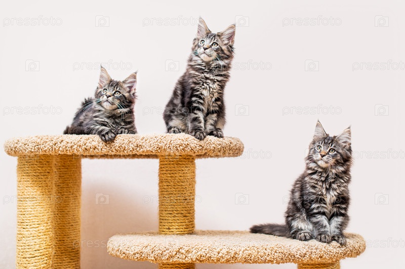 Три котенка мейн-куна с длинным пушистым хвостом сидят на когтеточке у светлой стены
