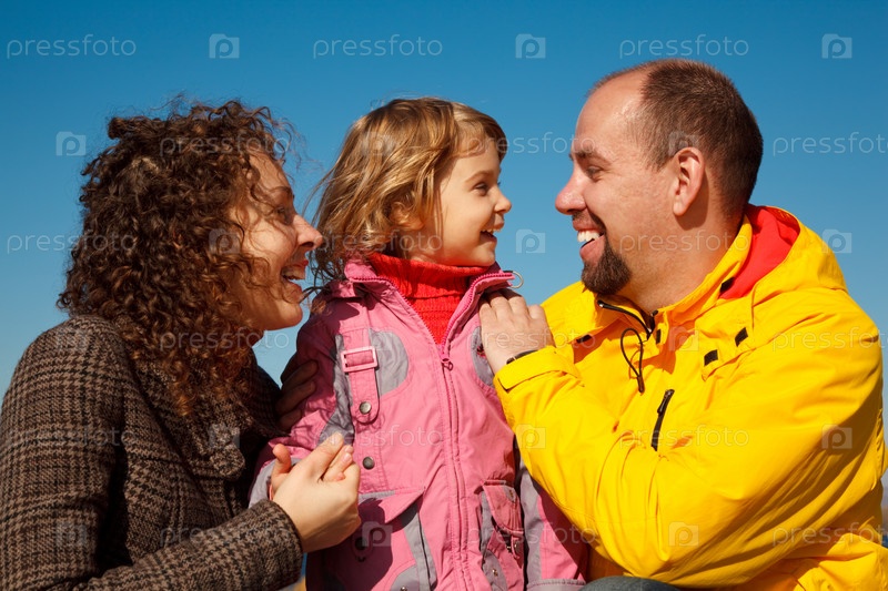 Счастливая семья на прогулке на фоне голубого неба