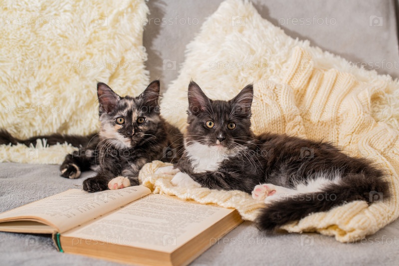 Два котенка мейн-куна играют лежа на вязаном свитере рядом с открытой книгой в уютной атмосфере
