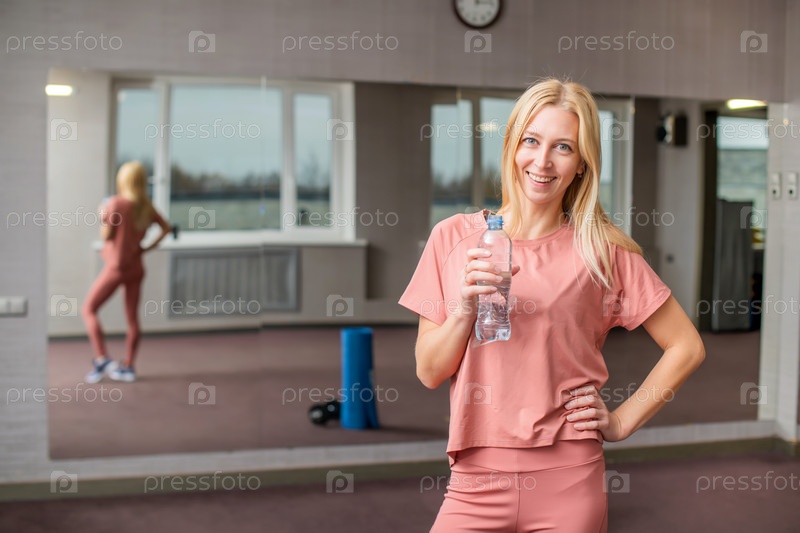 Улыбающаяся блондинка держит в руке бутылку воды в спортзале