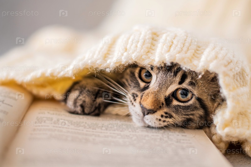 Мордочка полосатого котенка, спрятавшегося в вязаном свитере, смотрящего на страницу книги