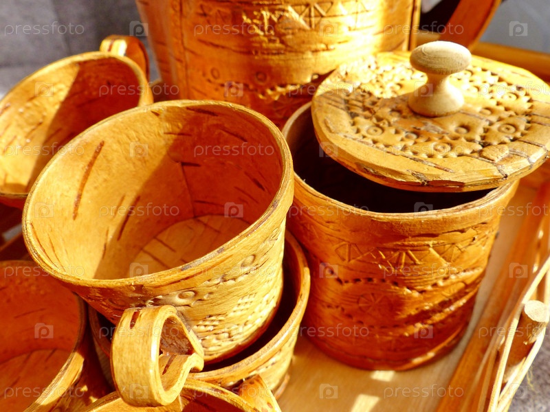 Чашки, чайник,сахарница и поднос из бересты. Кухонные принадлежности. Народные промыслы России. Ретро. Изделия из бересты изготавливались большинством обществ задолго до того, как была изобретена керамика