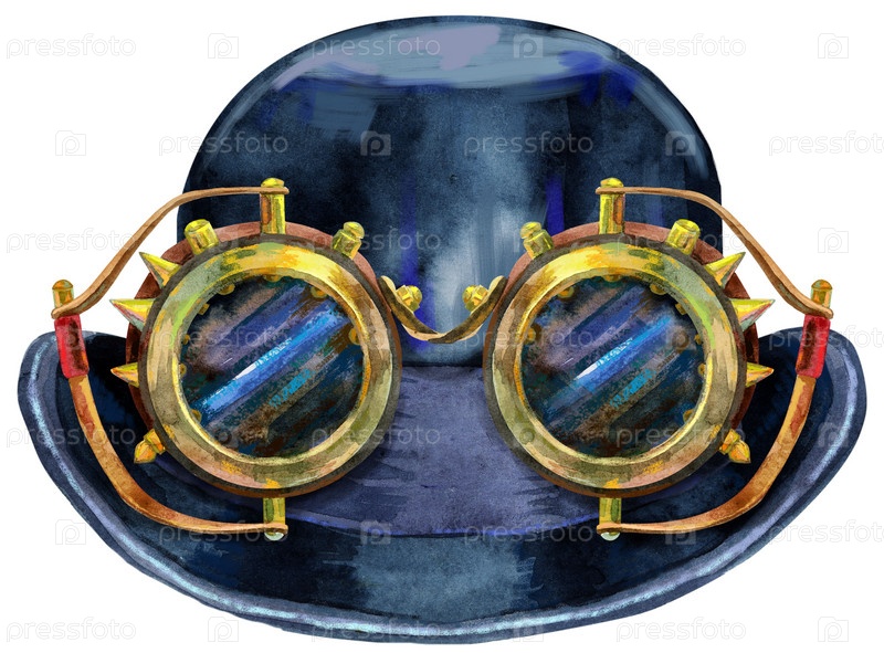 Котелок в черной шляпе акварели с иллюстрацией в очках стимпанк. Для дизайна одежды