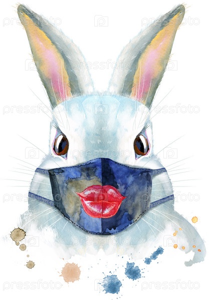 Милый белый кролик в защитной маске на белом фоне с брызгами, изолированный