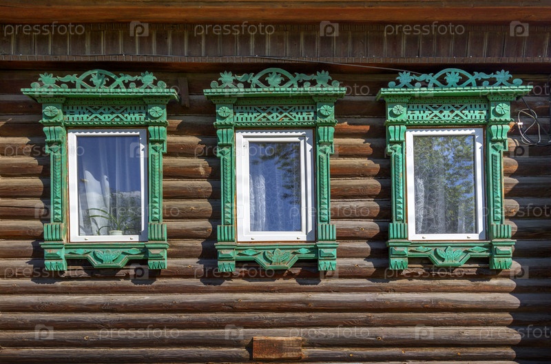 Старые резные окна деревянного дома в городе Семенов. Нижегородская область, Россия