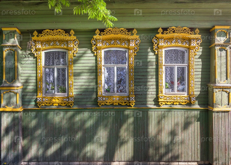 Старые резные окна деревянного дома в городе Семенов. Нижегородская область, Россия