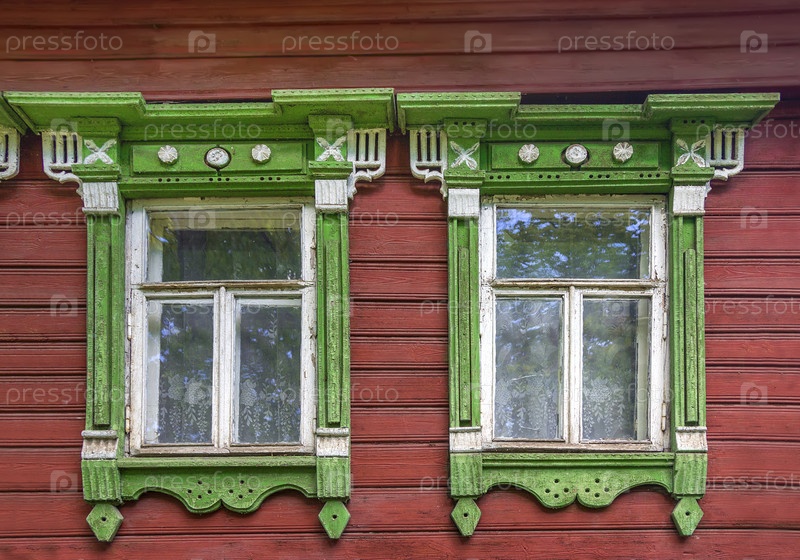 Старые резные окна деревянного дома в городе Семенов. Нижегородская область, Россия