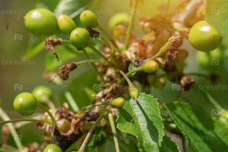 Весной на дереве созревают незрелые зеленые вишни, малая глубина резкости, фон зеленых листьев