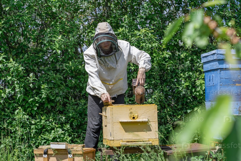 Пчеловод выполняет работу на пасеке. Концепция пчеловодства. Пчеловод работает курильщиком