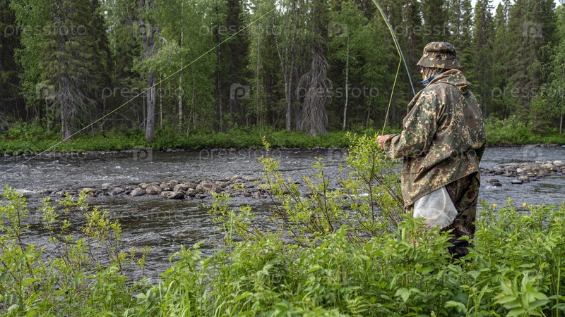 Рыбак в горной реке ловит форель, утро. Вид сбоку
