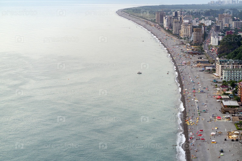 Вид сверху в солнечный день на побережье морского курорта в разгар туристического сезона. Люди отдыхают и загорают на пляже в Квариати и Гонио в Аджарии