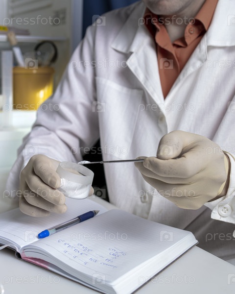 Ученый работает с лабораторными образцами пищевых добавок и делает записи в блокноте