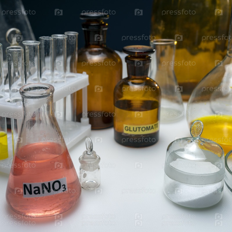 Пищевые добавки в пробирках и колбах на лабораторном столе. пищевая лаборатория
