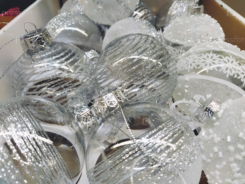 Большие прозрачные красивые елочные шары в коробке на полке в магазине. Продажа рождественских новогодних игрушек и украшений перед праздником. Стеклянные елочные украшения