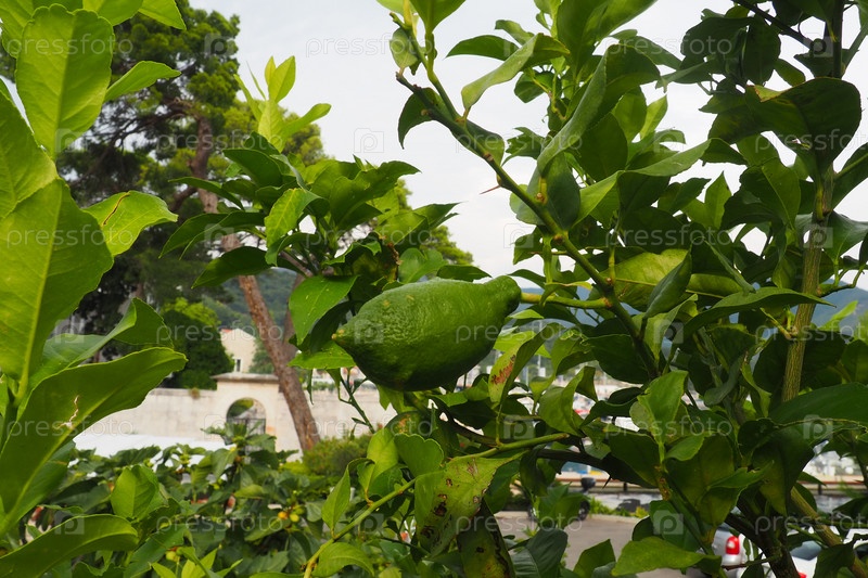 Зеленые незрелые продолговатые лимоны на ветке лимонного дерева в саду в Черногории. Созревание урожая в саду. Сельское хозяйство и производство овощей и фруктов. Органические продукты