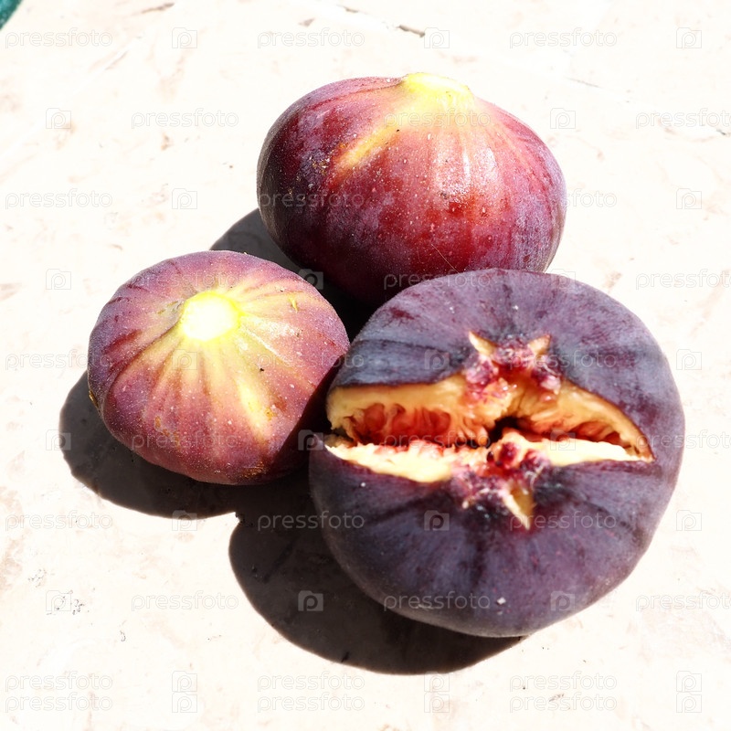 Фикус или фиквы, или обыкновенная инжирка, или Ficus carica субтропическое листопадное растение рода Фикуса семейства Тутовых. Зрелые фиолетовые плоды смоковницы на светлом фоне. Здоровая пища