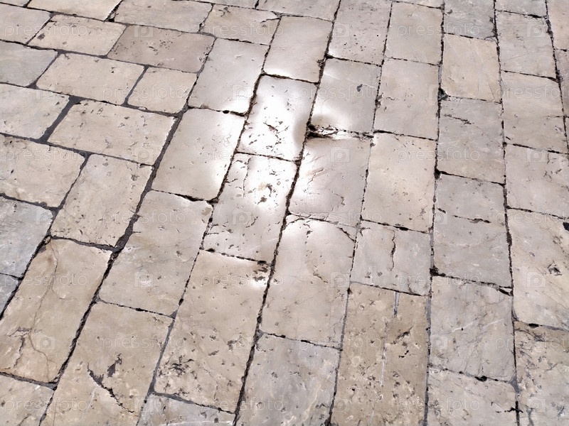 Мраморный пол на улице, Дубровник, Хорватия. Древняя кирпичная кладка прямоугольных блоков. Метаморфическая порода, состоящая из кальцита CaCO3, смешанного с другими минералами. Полированная плитка блестит под солнцем