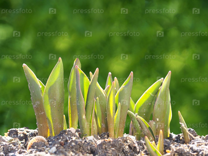 Маленькие весенние ростки тюльпанов – это как новая жизнь. Молодые растения в земле в солнечном свете на зеленом фоне. зеленые всходы тюльпанов. Побеги весенних цветов