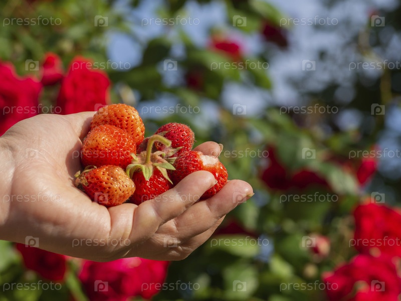 Ладонь, наполненная спелой красной клубникой. Крупный план натуральных органических ягод на женской руке при солнечном свете на фоне расфокусированного куста красной розы с цветами и небом