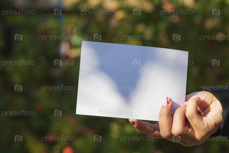 Женская рука с белым чистым листом бумаги на открытом воздухе на зеленом фоне природы. Скопируйте место для текста. Протестный активист. Бумага в руке на фоне размытой зеленой листвы