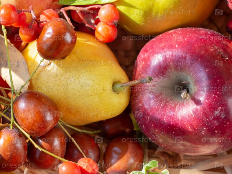 Осенний натюрморт со спелыми фруктами и ягодами. Крупный план груши, яблока, унаби, фестиваля урожая рябины