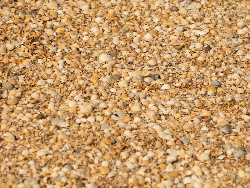 Морской естественный абстрактный фон многих ракушек, малая глубина резкости выборочного фокуса. Желтые раковины в солнечном свете